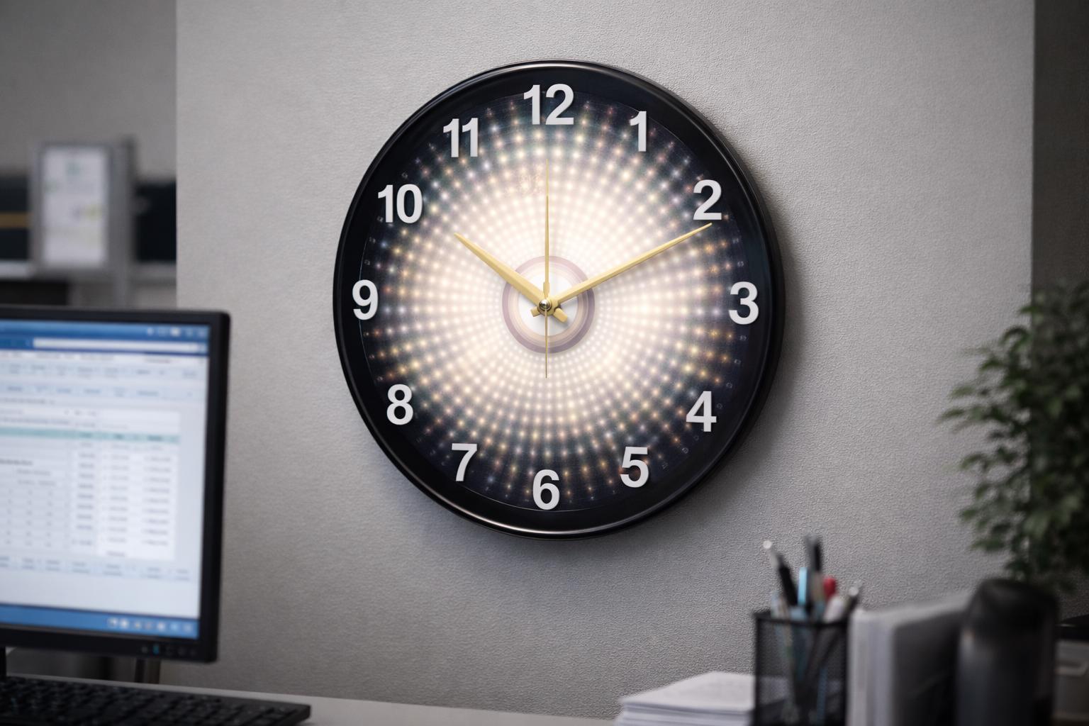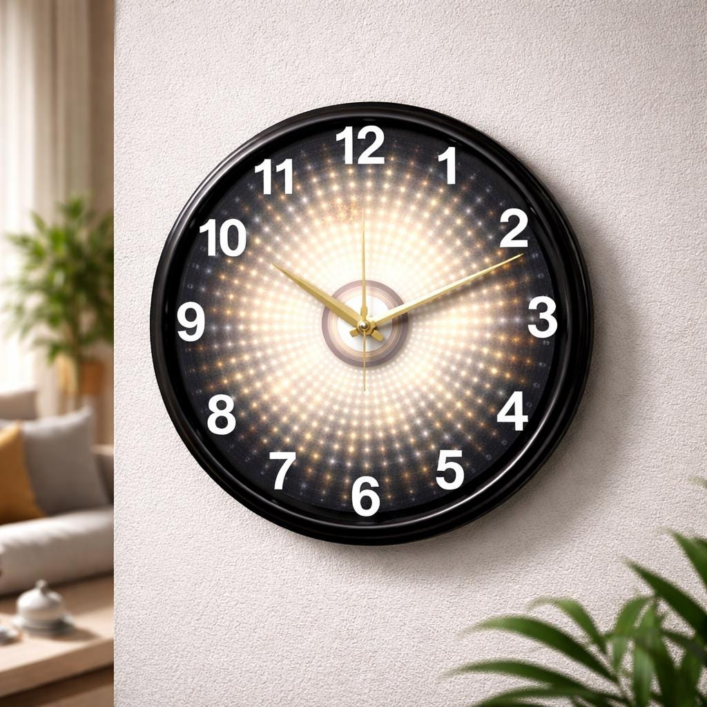 Add a modern and eye-catching accent to your space with this Light Halo Glass Wall Clock. Featuring a radiant circular light pattern that draws the eye toward the center, this decorative timepiece combines contemporary style with a clean geometric aesthetic. The glowing visual effect and bold contrast create a striking look that brings depth, energy, and sophistication to any wall.