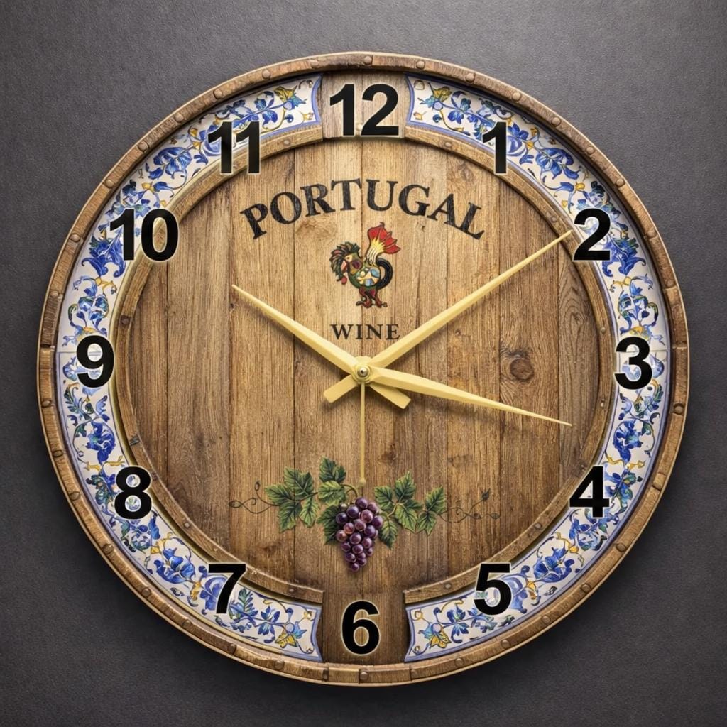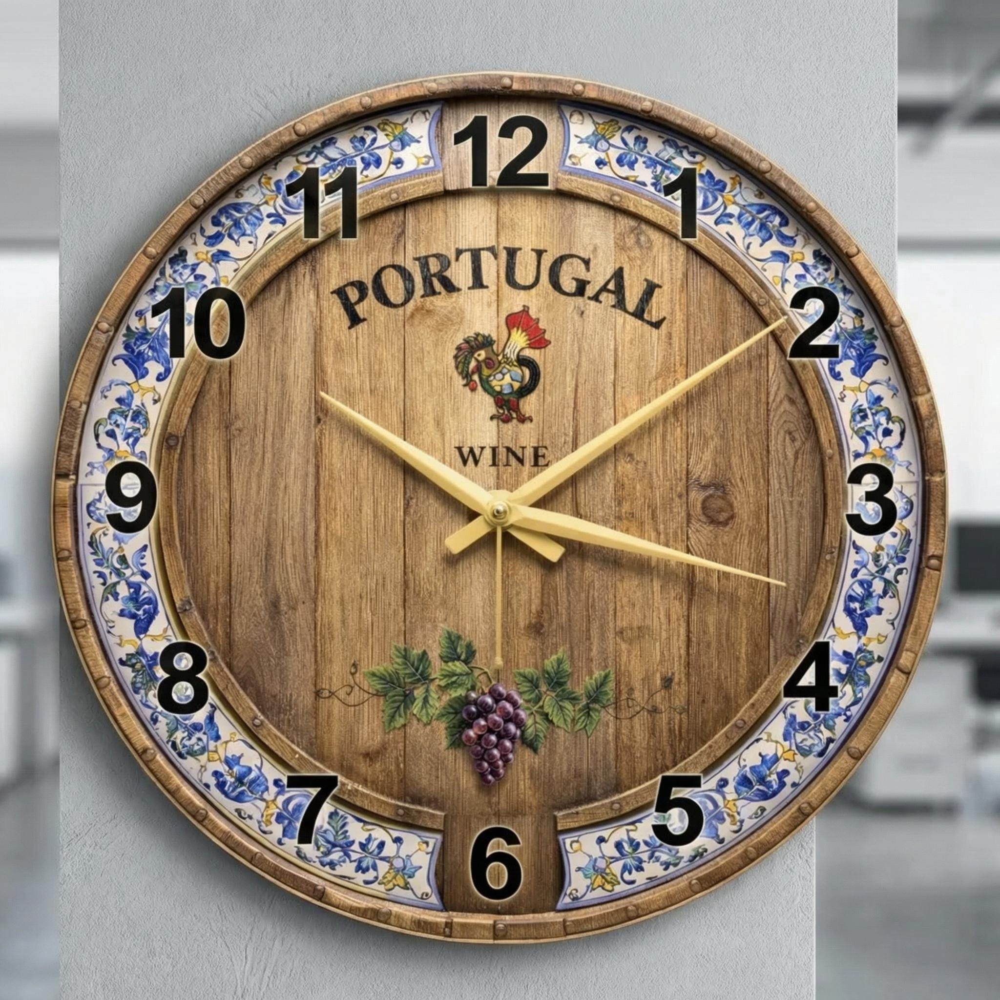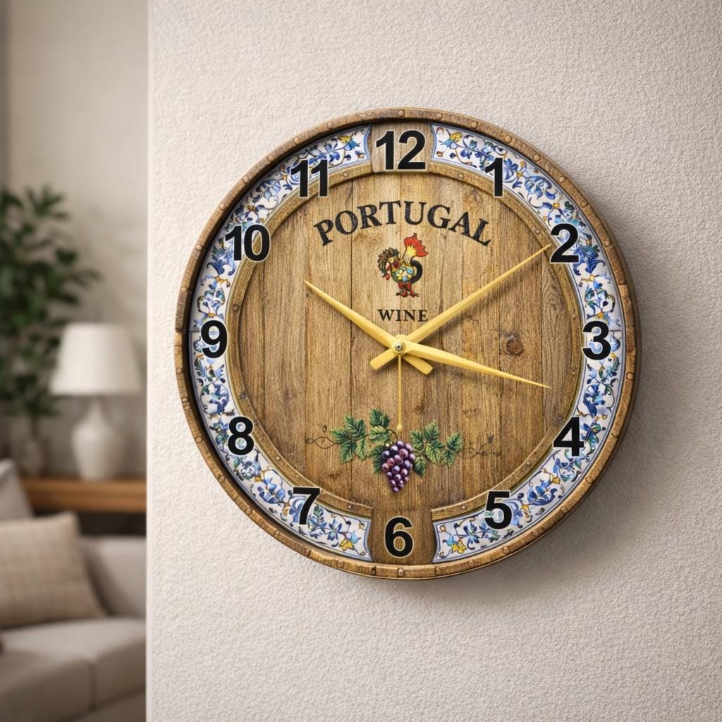Add rustic charm and Mediterranean character to your space with this Portugal Wine Glass Wall Clock. Featuring a warm wood-look background, decorative floral border, and vineyard-inspired artwork, this clock captures the inviting spirit of Portuguese wine culture in a stylish and timeless design. The rich details and vintage aesthetic make it a beautiful wall accent for both classic and casual interiors.