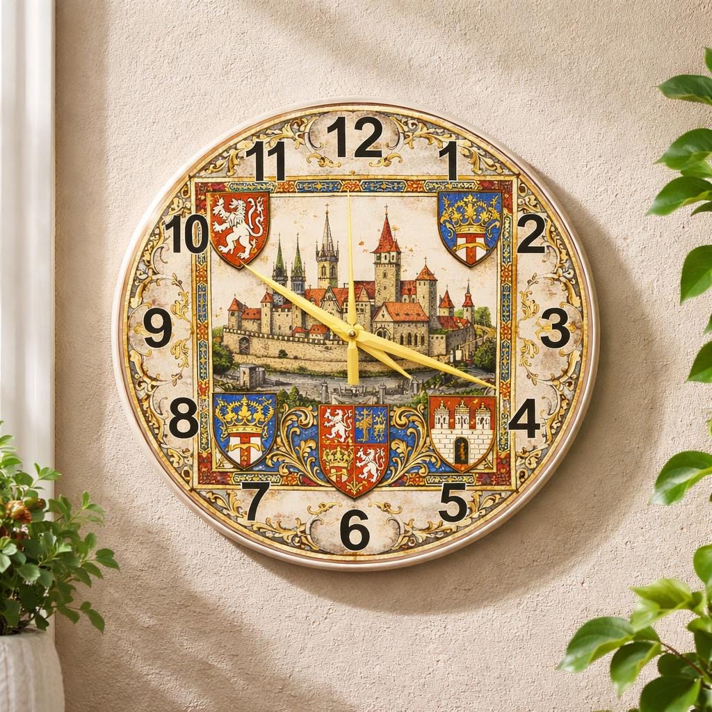 Bring historic charm and classic elegance into your space with this Vintage Castle Glass Wall Clock. Featuring a richly detailed castle illustration framed by ornate decorative borders and heraldic crest elements, this design captures the beauty of old-world artistry in a refined and timeless way. The warm antique tones and intricate composition make it a striking wall accent that adds character and sophistication to any room.